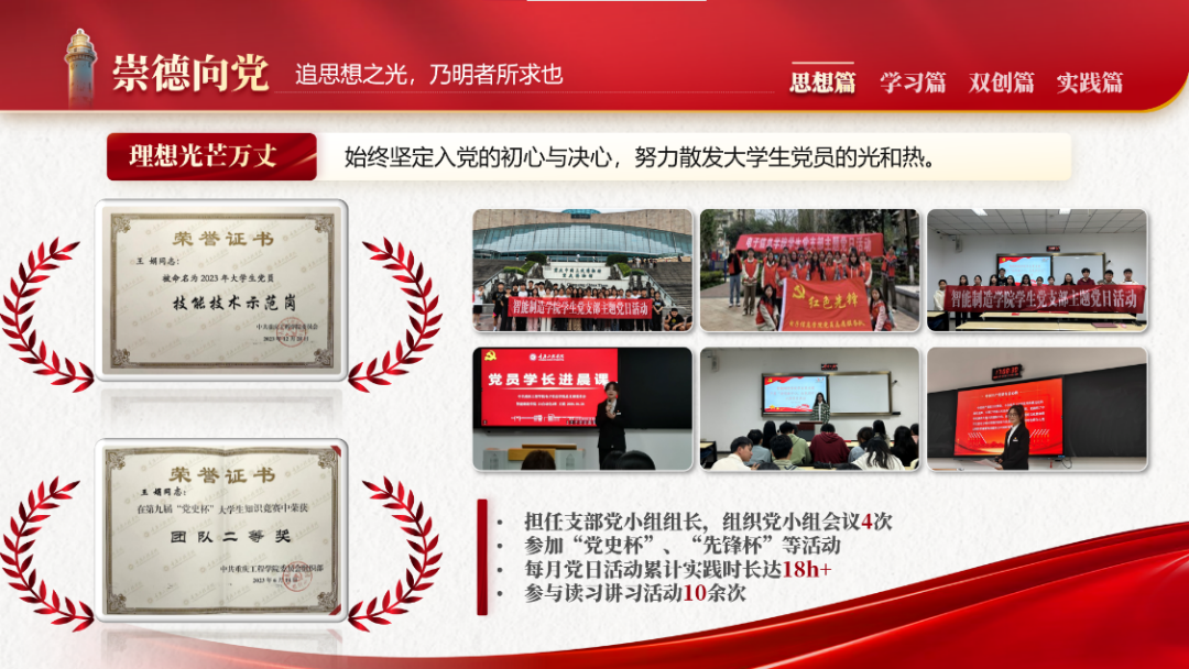 在向下扎根沉淀中汲取信仰力量。如果信仰有颜色,那一定是中国红。入学之初,她便提交了入党申请书,积极地向党组织靠拢,经过自身不懈的坚持与努力以及党组织的培养与考察,现已成功加入中国共产党。在此期间她积极参与策划党日活动,被评为大学生党员“技术技能示范岗”。投身社会实践,增强服务意识,始终坚定入党的初心与决心,努力散发大学生党员的光和热。