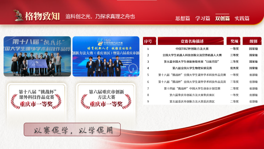 格物致知,提高创新实践能力。在科研实践中,她从竞赛小白到参加多项国赛,做好一个项目需要有耐心、有规划、有信仰的去实施,“以赛促学、以学促用”。去年3月,她组建项目团队,参加第十八届“挑战杯”竞赛,经过数不清的日日夜夜、共同奋战,最终以学校第一名的成绩入选重庆市答辩,获得重庆市一等奖。