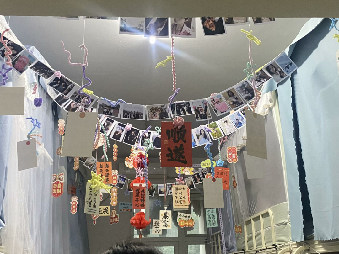 推开房门,映入眼帘的是精心布置的墙纸,柔和的灯光下,整齐摆放的小摆件、悬挂在墙上的照片墙,处处都彰显着宿舍成员们对生活的热爱。她们一起养绿植,给每一株小生命取可爱的名字;一起DIY手工装饰,让原本单调的宿舍变得独一无二。