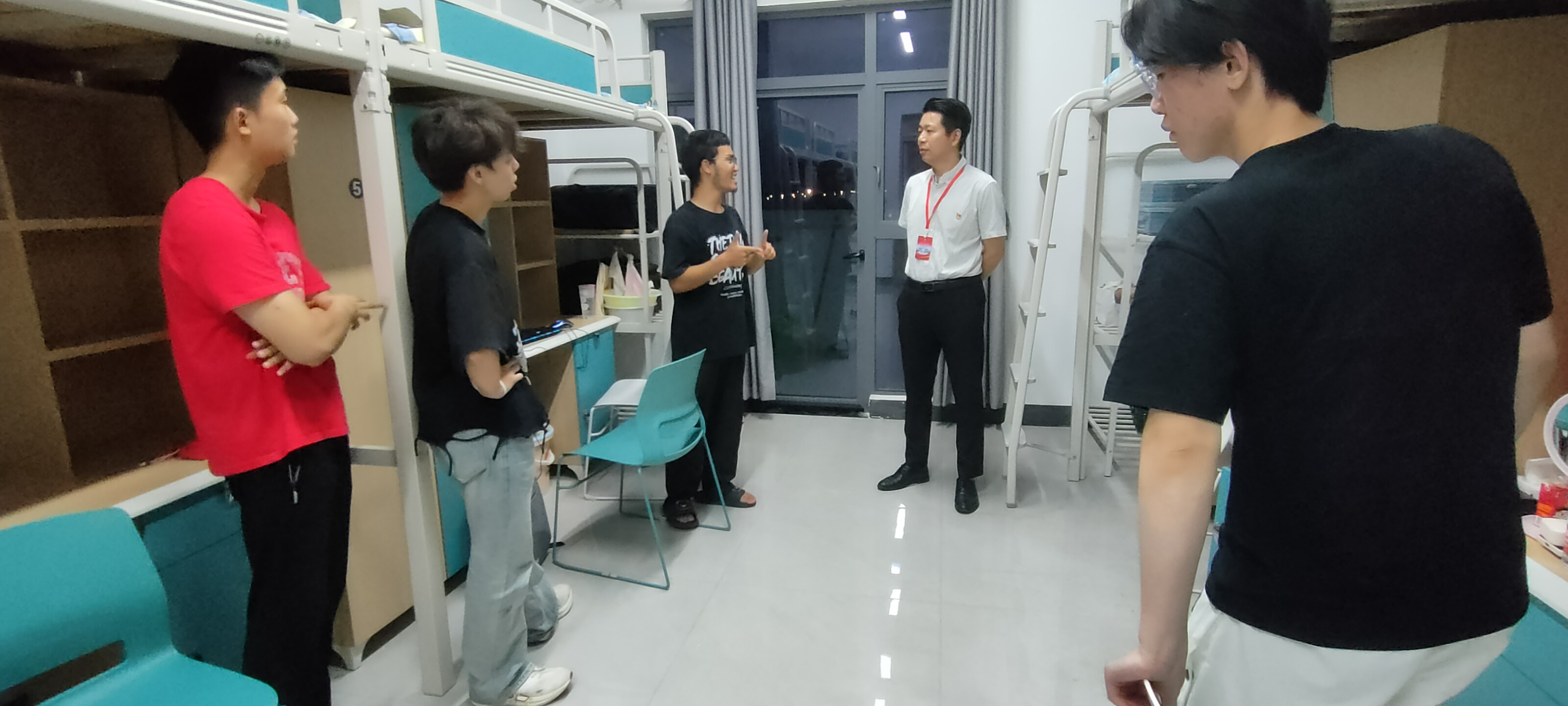 走进宿舍,学工团队成员先关切询问新生入学后的住宿适应情况,查看宿舍设施是否完备,从“床铺是否舒适” 到“饮食是否习惯”,细致叮嘱解决问题的办法,让初入校园的新生倍感温暖。