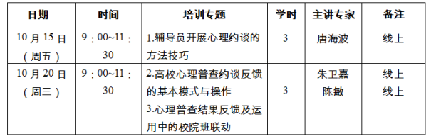大学生心理普查与约谈反馈工作是我校每年秋季的重要任务,为提高我校心理普查与约谈反馈的科学性和有效性,经大学生素质教育中心研究决定在线上开展心理普查与约谈反馈专题培训。具体安排如下: