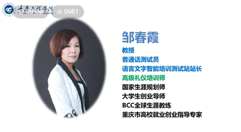 本网讯(图/文 大学生素质教育中心)为进一步加强校园文化建设和大学生素质教育,激发学生对《演讲与口才》这门课程的兴趣与重视,10月5日下午,重庆工程学院大学生素质教育中心邹春霞教授在小鹅通直播平台上开展了题为“让口才训练像游戏通关一样简单有趣”的专题讲座。邹教授是重庆工程学院大学生素质教育中心副主任,具备普通话测试员、高级礼仪培训师、职业生涯规划师、大学生创业导师、BCC全球生涯教练等资格,也是重庆市高校就业创业指导专家,中国高等教育学会素质教育分会理事。