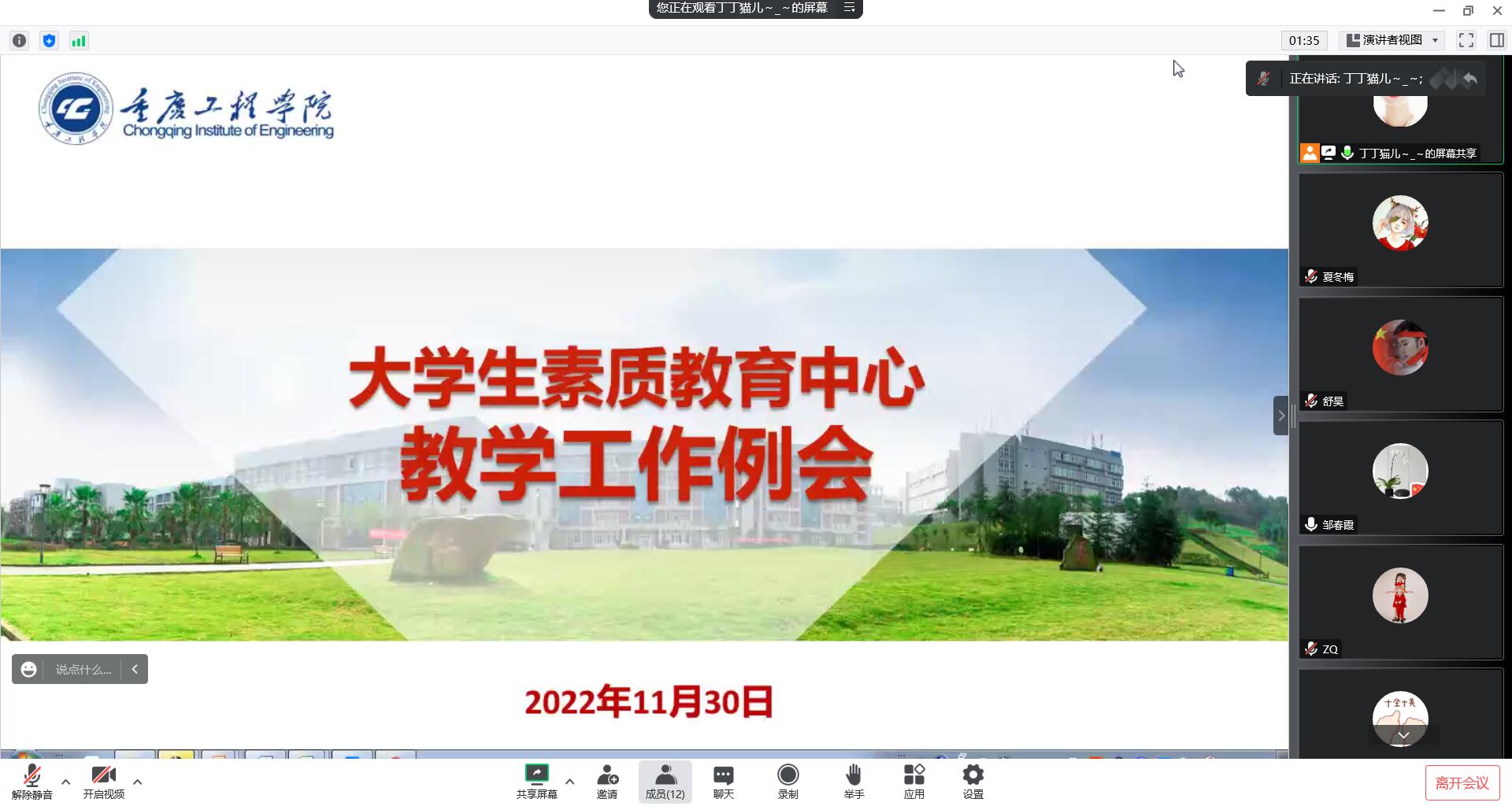 本网讯(大学生素质教育中心)2022年11月30日,大学生素质教育中心在腾讯会议召开11月期末教学工作例会,中心所有教研室主任及相关人员参加会议,会议由主任助理卢颖主持。