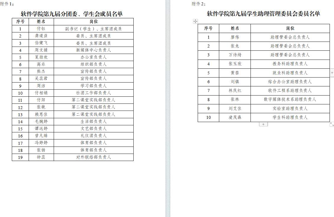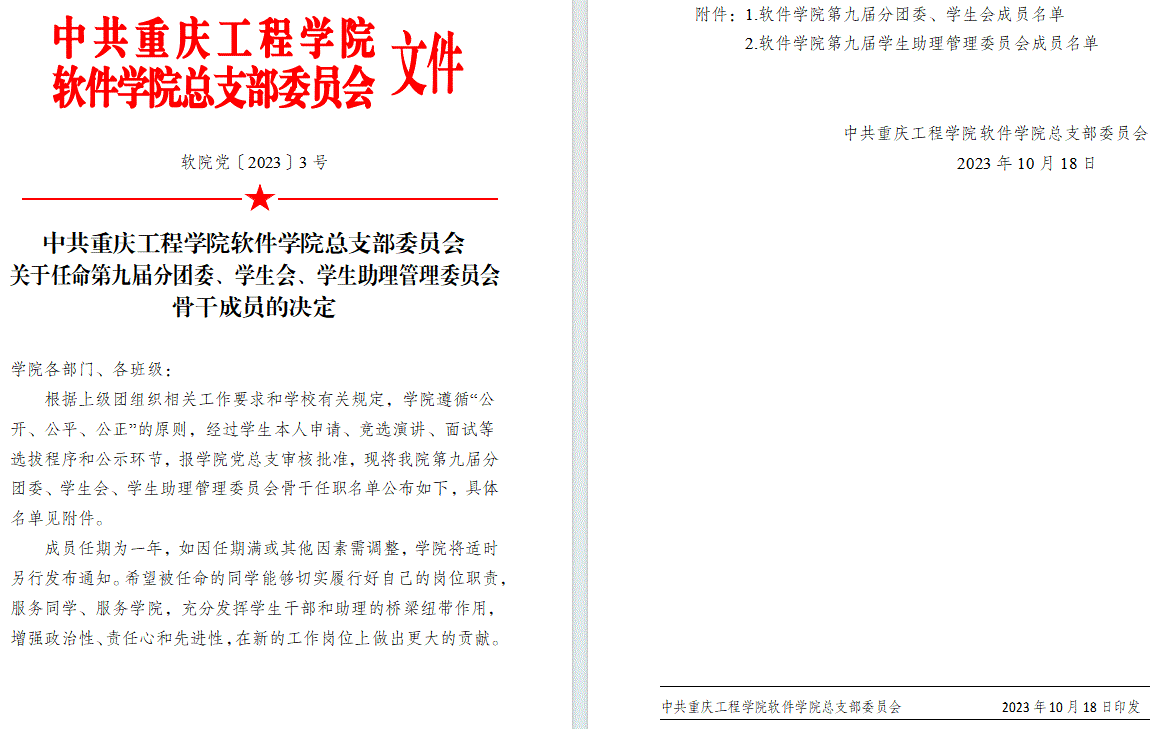 中共重庆工程学院软件学院党总支委员会关于任命第九届分团委、学生会、学生助理管理委员会骨干成员的决定