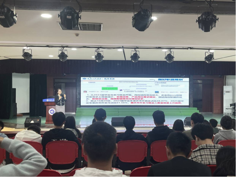 刘子菱书记从做好职涯规划、夯实学业基础、提升职业能力、聚焦目标行动四个方面为同学们进行了细致的讲解,分析了当前就业形势和岗位结构变化,强调要守好学业底线、提升学用能力、聚焦学习成果、关注目标岗位胜任力需求等,鼓励同学们走出“舒适区”,告别 “佛丧衰”,以奋斗的姿态迎接新的人生挑战。