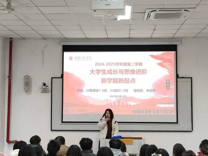 2月23日,软件学院23数媒技1-3班及23虚拟1-2班全体同学在第六教学楼召开新学期首次主题班会,主题为“开学第一课:大学生成长与思维进阶”。班会由辅导员李晨燕主持,围绕“上学期工作总结”“新学期规划与成长目标”“AI+新学期”“健康安全提醒”四大板块展开,旨在引导学生明确目标、拓展视野,以积极姿态迎接新学期挑战。