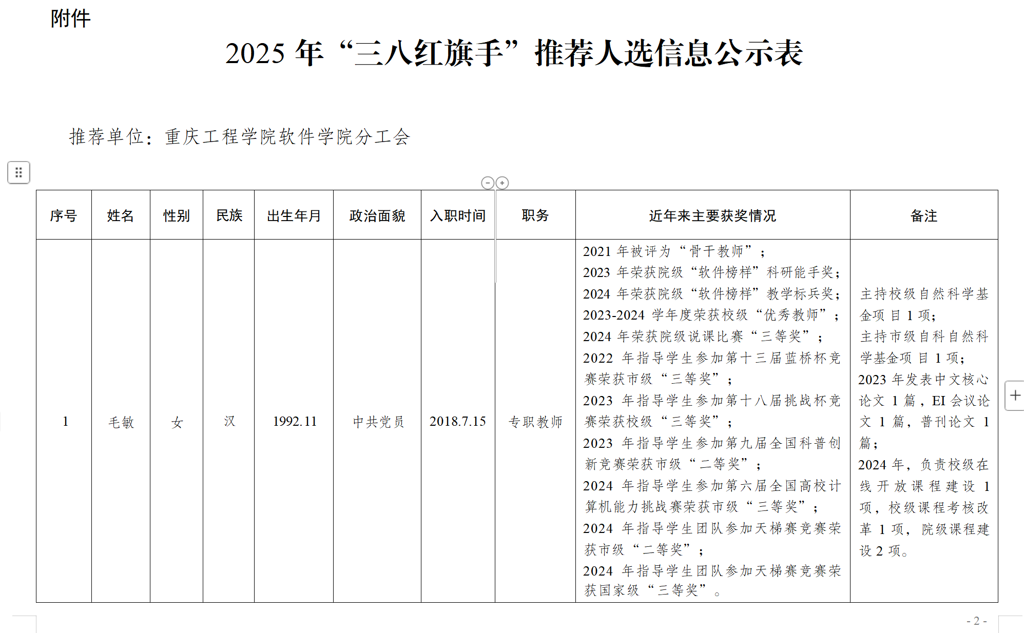 根据《重庆工程学院工会委员会关于评选表彰 2025 年“ 三八红旗 手”和“ 四好女教职工”的通知》(渝工程院工〔2024〕4 号)文件要 求,通过个人申请,系部推荐,分工会委员会讨论,学院党政联席会 审核,现将学院“ 三八红旗手”推荐候选人名单进行公示,公示时间 为 2 天。如对公示名单有不同意见的,请于公示期内(2025 年 1 月 5 日至 2025 年 1 月 6 日)向分工会反映,联系人:孟丽娟;电话:62840185。
