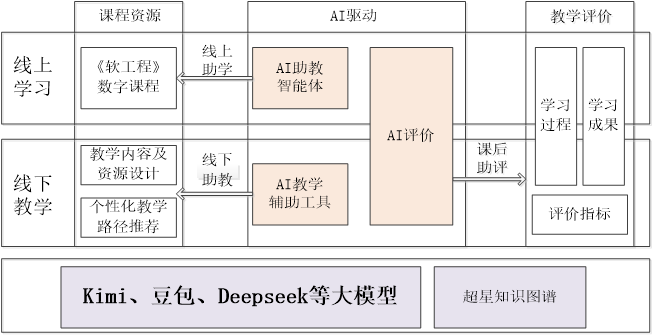 通过讨论确定了课程教学设计思路,分为AI线上助学、AI线下助教、AI学后助评等板块。课程整体按线上与线下混合模式进行教学,线上资源为《软件工程》数字课程。教学中深度结合AI,贯穿全教学过程,课程设计思路如图1所示。