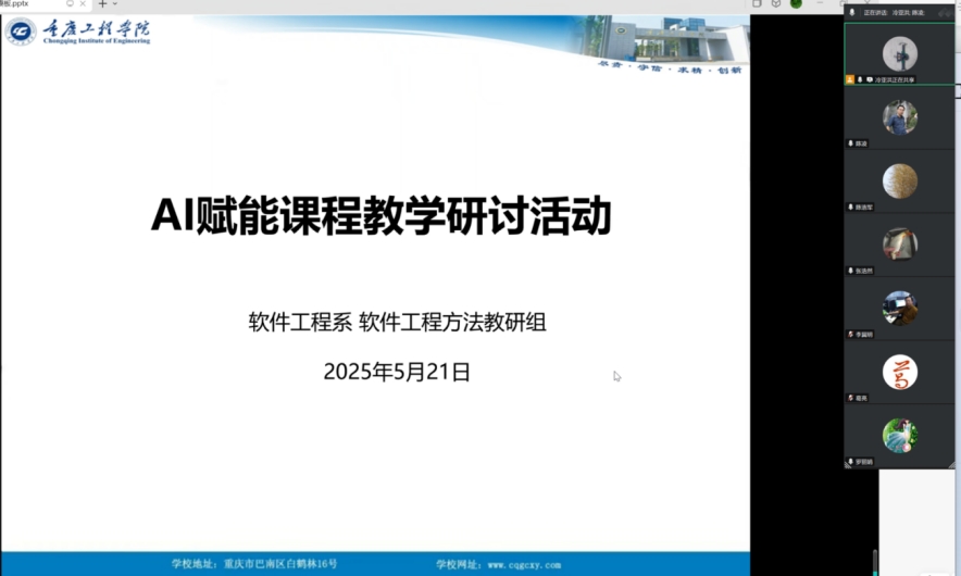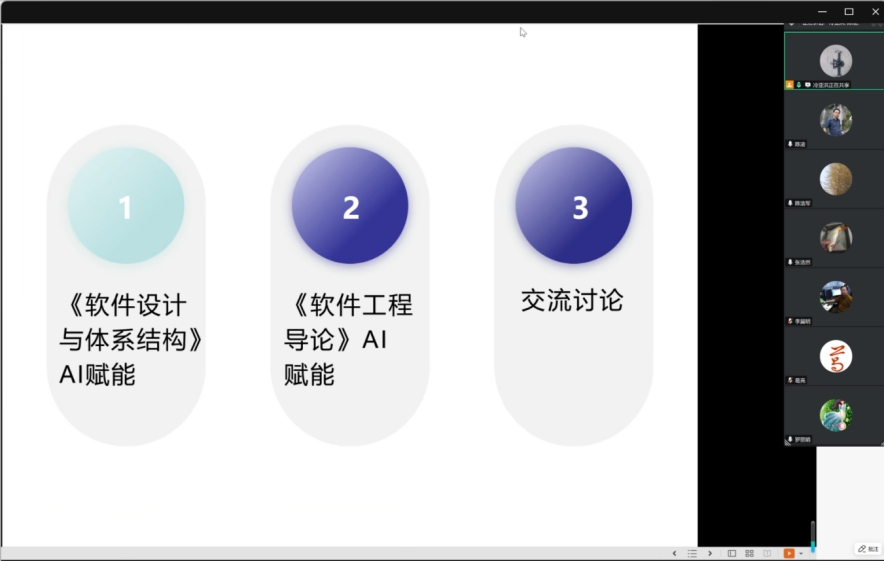 (文/图 软件学院 冷亚洪)2025年5月21日19:00-20:30,软件工程系软件工程方法教研组通过腾讯会议成功组织了一场聚焦“AI与课程教学融合”的教研活动。本次活动围绕《软件设计与体系结构》《软件工程导论》两门核心课程,就如何有效结合人工智能开展教学展开了深入的分享与讨论。教研组全体成员齐聚云端,共同为提升课程教学质量、探索软件工程教育新路径出谋划策。