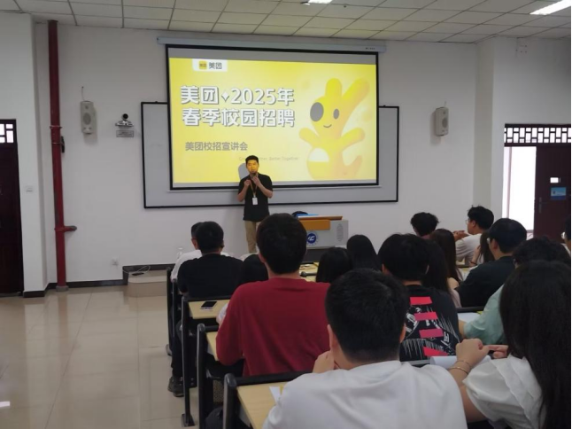 (图/文 软件学院 滕攀)2025年5月27日下午,软件学院在6301开展美团2025春季校园招聘宣讲会。本次宣讲会主要是针对2026届毕业生,软件前端开发、客户端开发及软件测试等岗位,招聘人数在70人左右。公司招聘负责人黄思源一行4人来校招聘,软件学院、计算机学院组织近200名2026届毕业生参加宣讲会。
