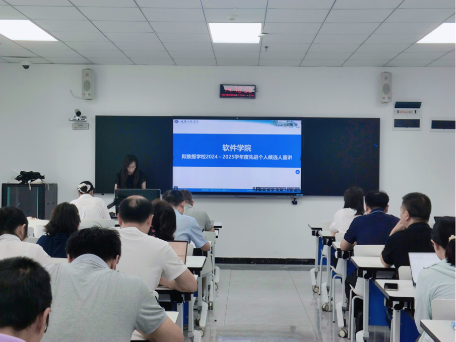 (软件学院 图/文 何姗珊)为表彰在教学、科研、育人等方面表现卓越的教师,树立先进典型,激发教师队伍的工作热情与创新活力,6月6日下午,软件学院举办2024~2025学年度先进个人候选人事迹宣讲会,9位候选人预备人选参加宣讲,学院全体教职工共同参会。