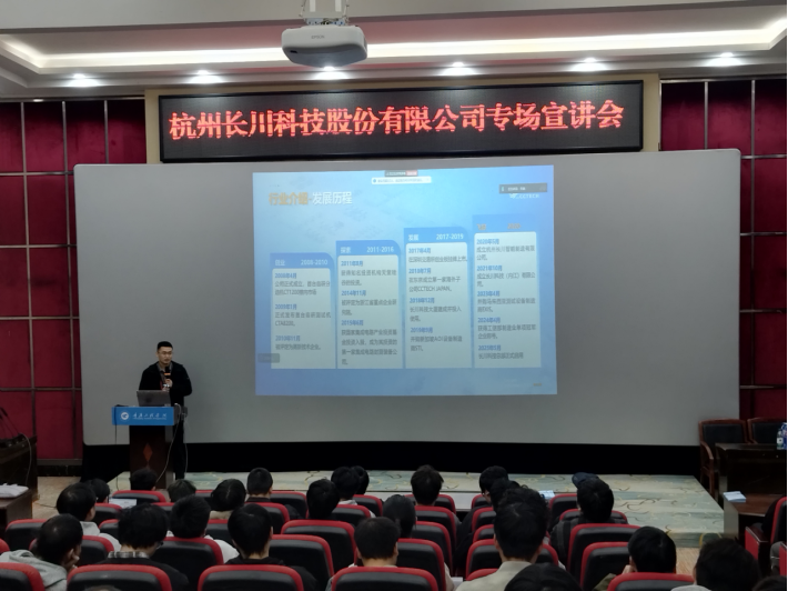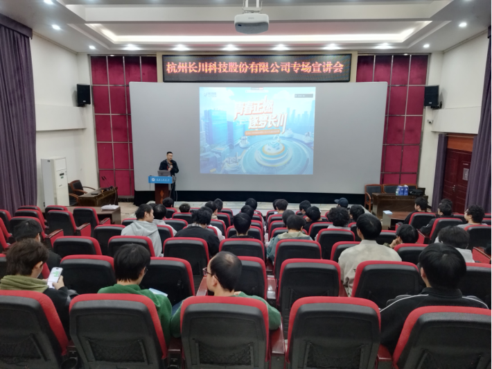 本网讯(文/图 软件学院 滕攀)2025年11月7日上午,软件学院在办公楼阶梯报告厅开展杭州长川科技股份有限公司专场宣讲会,公司西南片区人事负责人岳健亲自来校宣讲。本次宣讲会面向软件、计算机、电子及智能制造等多个专业,主要有自动化及应用软件开发、质量检测、调试等岗位,需求人数较多,70余名2026届毕业生参加宣讲会。