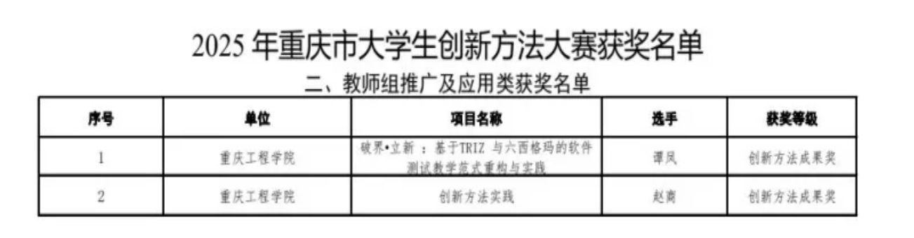 (文/图 软件学院 赵商)在11月29日举行的“2025年重庆市大学生创新方法大赛”教师组评选中,软件学院谭凤、赵商两位老师凭借扎实的教学创新成果与突出的实践成效,从全市高校中脱颖而出,分别荣获“创新方法成果奖”第2名、第3名。两位教师自2025年11月起进入备赛状态,围绕“创新方法在课程中的深度应用”这一主题,系统梳理了近年来在课程建设、教学改革、学生竞赛指导等方面的成果,重点突出教学方法的创新实践,持续推动育人成效的稳步提升。