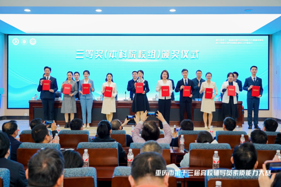 本网讯(文/图 学生处 吕颖莉)4月3日,重庆市第十三届高校辅导员素质能力大赛圆满落幕。我校双桥校区辅导员李小凤凭借扎实的理论功底、过硬的职业素养和出色的现场表现,在激烈的竞争中脱颖而出,荣获大赛三等奖。这一成绩不仅彰显了我校辅导员队伍建设的显著成效,也为学校在思想政治教育领域再添殊荣。
