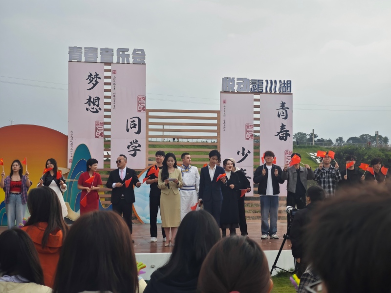 演出现场灯光璀璨,气氛热烈,我校师生有序入座观演区。舞台上,优秀乐队及音乐人轮番登场。演出节目内容丰富,形式多样,既有激情四射的摇滚乐曲,也有悠扬动人的民谣演唱,更有时尚流行的音乐作品。绚丽多彩的舞台效果与龙水湖的自然美景相映成趣,为同学们营造了沉浸式的艺术体验。