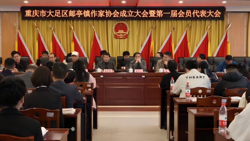 大会严格依照既定流程推进,前期预备会议中,参会代表审议通过协会筹备工作报告、大会议程及选举办法等多项内容,依法选举产生邮亭镇作家协会第一届主席团,为协会规范化运行筑牢组织根基。短暂休息后,正式会议在庄严的国歌声中拉开帷幕,会上介绍了出席领导及嘉宾,大足区作家协会宣读大会召开批复,双桥诗词楹联协会等群团组织致贺词。邮亭镇、大足区文联及区作家协会相关领导先后致辞,对协会成立表示祝贺,同时寄予厚望,希望协会扎根本土,以文学笔触讲好邮亭故事。
