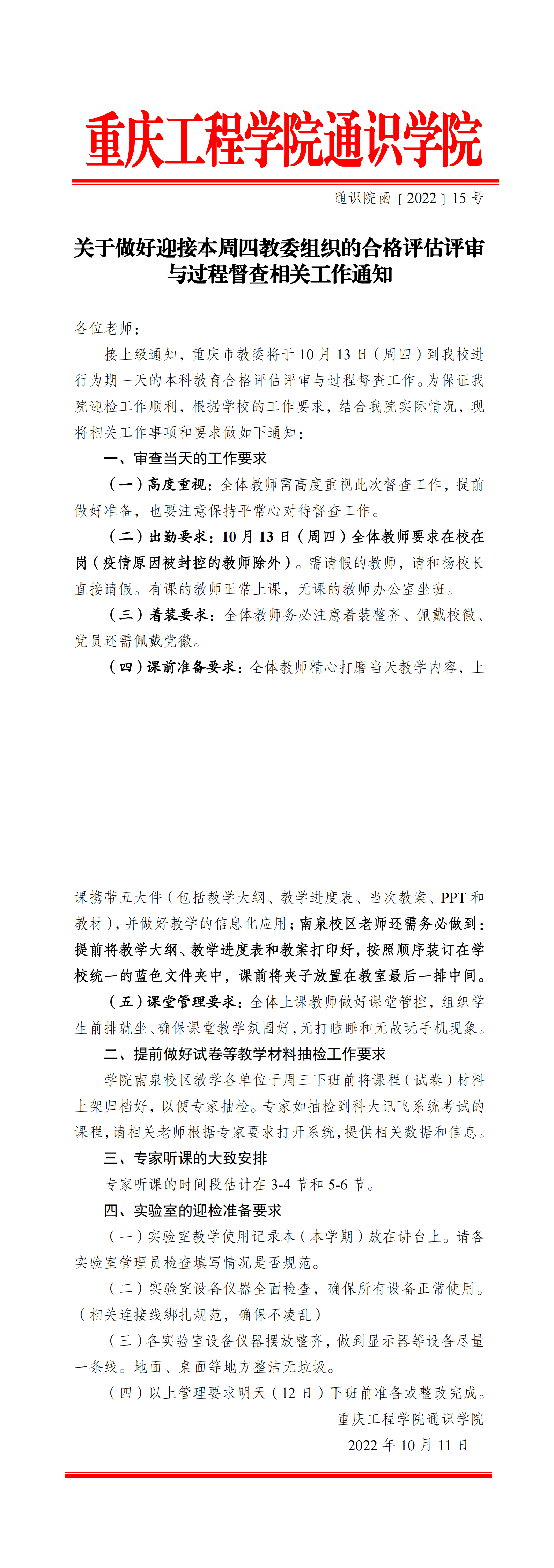 关于做好迎接本周四教委组织的合格评估评审与过程督查相关工作通知