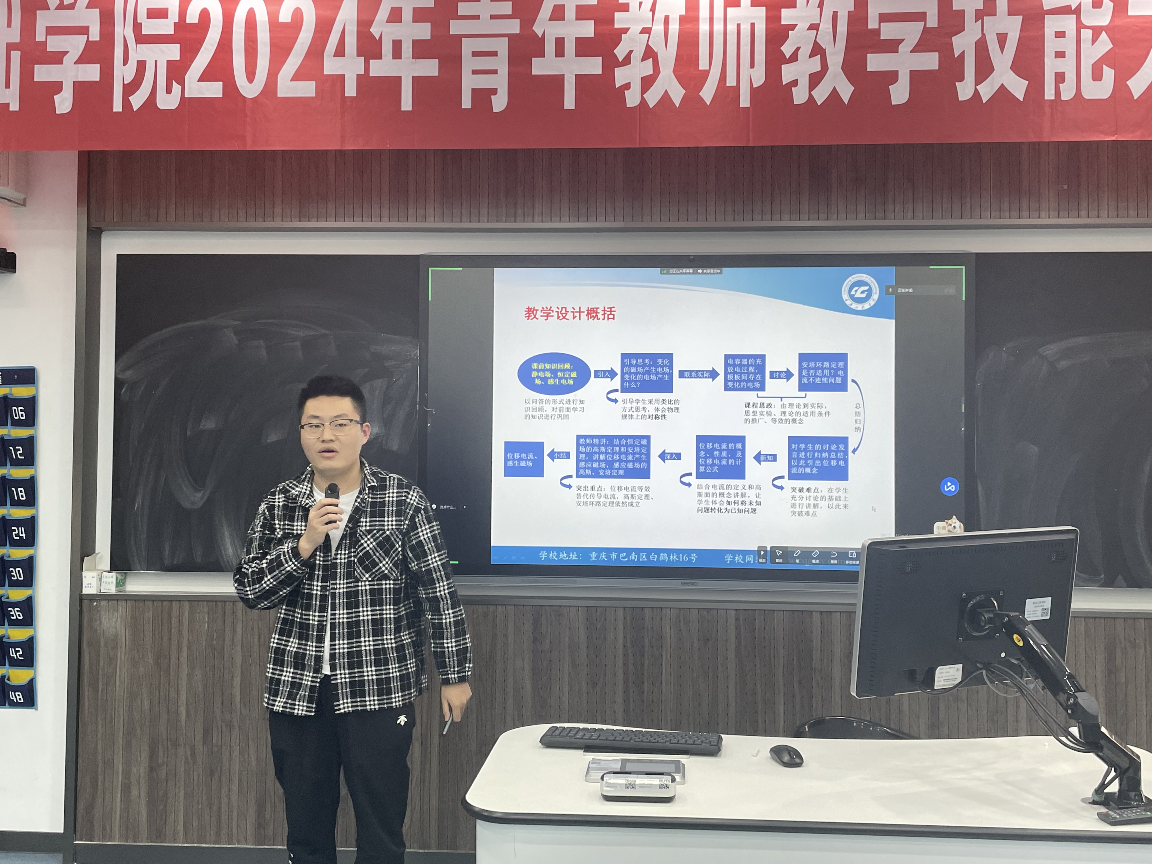 为了进一步提升教师的教学能力,基础学院开展了2024年青年教师教学技能比赛。4月10日下午,基础学院在双桥校区第一教学楼201教室开展了院级决赛,来自不同学科的十一位青年教师齐聚一堂,以精彩的教学展示诠释了教育的魅力与力量。