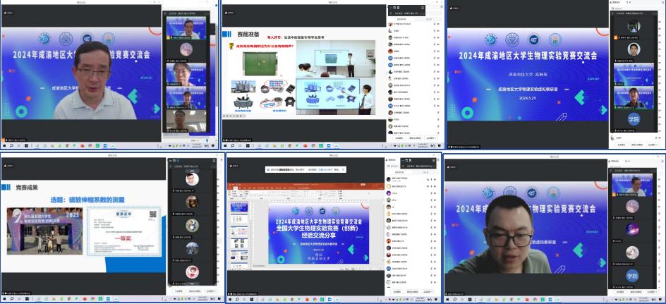 本网讯(文/图 基础学院 廖新华)本着“联系实际、追踪前沿、教学结合、突出实效”的目的,2024年5月29日14:00,成渝地区大学物理实验虚拟教研室以线上线下相结合的形式举办了2024年成渝地区大学物理实验竞赛交流会。本次交流会由重庆工程学院廖新华教授主持,来自重庆大学、西南大学、重庆工程学院、西南石油大学、西南科技大学等高校师生共50多人参与会议。