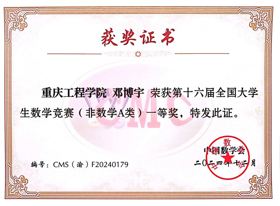 近日,2024年第十六届全国大学生数学竞赛(重庆赛区)结果公布,我校共有47名学生获奖。其中,一等奖6项,二等奖21项,三等奖20项。同时,赵战兴老师被重庆数学会评为重庆赛区“优秀指导教师”。