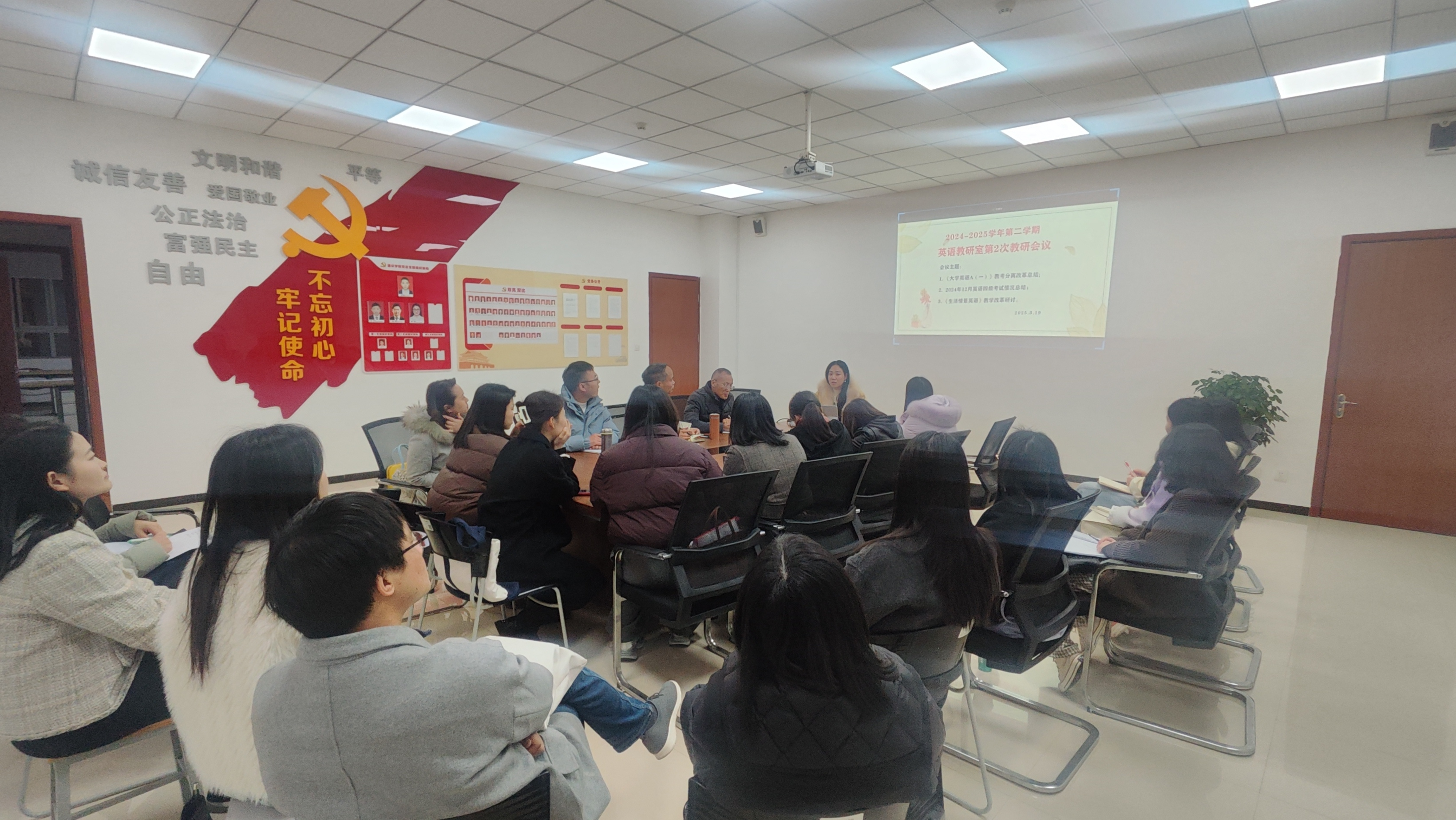 2025年3月19日21:00-21:30,外语教研室于办公楼402召开了《大学英语A(一)》教考分离改革总结会。会议采用线上线下结合的形式,由张金梅主任主持并担任汇报人。基础学院蒋国华院长、张楠副院长以及校级督导陈冰老师莅临指导,全体专职教师积极参与。