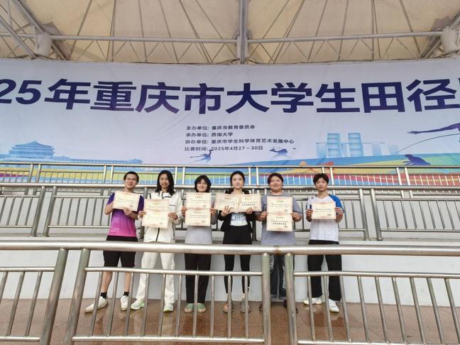 4月27日-30日,由重庆市教育委员会主办、西南大学承办的2025年重庆市大学生田径比赛在西南大学田径场举行。我校田径队展现了坚韧不拔的体育精神,8人荣获前八名、2人荣获体育道德风尚奖,是我校参加重庆市大学生田径比赛以来获得奖项最多的一年。