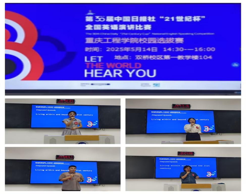 2025年5月14日14:30,“21世纪杯”全国英语演讲比赛重庆工程学院校赛复赛在双桥校区第一教学楼104教室顺利举行。经过激烈的竞争,最终推选出郑子熙和杨馥榕2名选手晋级川渝地区决赛。