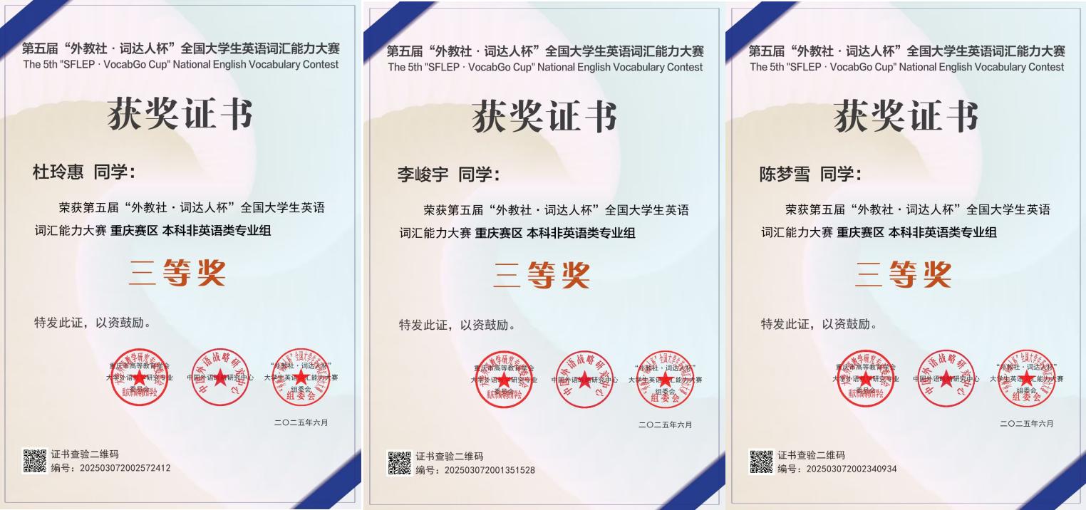 近日,2025年第五届“外教社・词达人杯”全国大学生英语词汇能力大赛省赛圆满落幕。我校参赛选手凭借扎实的英语功底和灵活的词汇运用能力从众多参赛选手中脱颖而出,喜获三等奖3项,刷新我校该项比赛历史成绩。