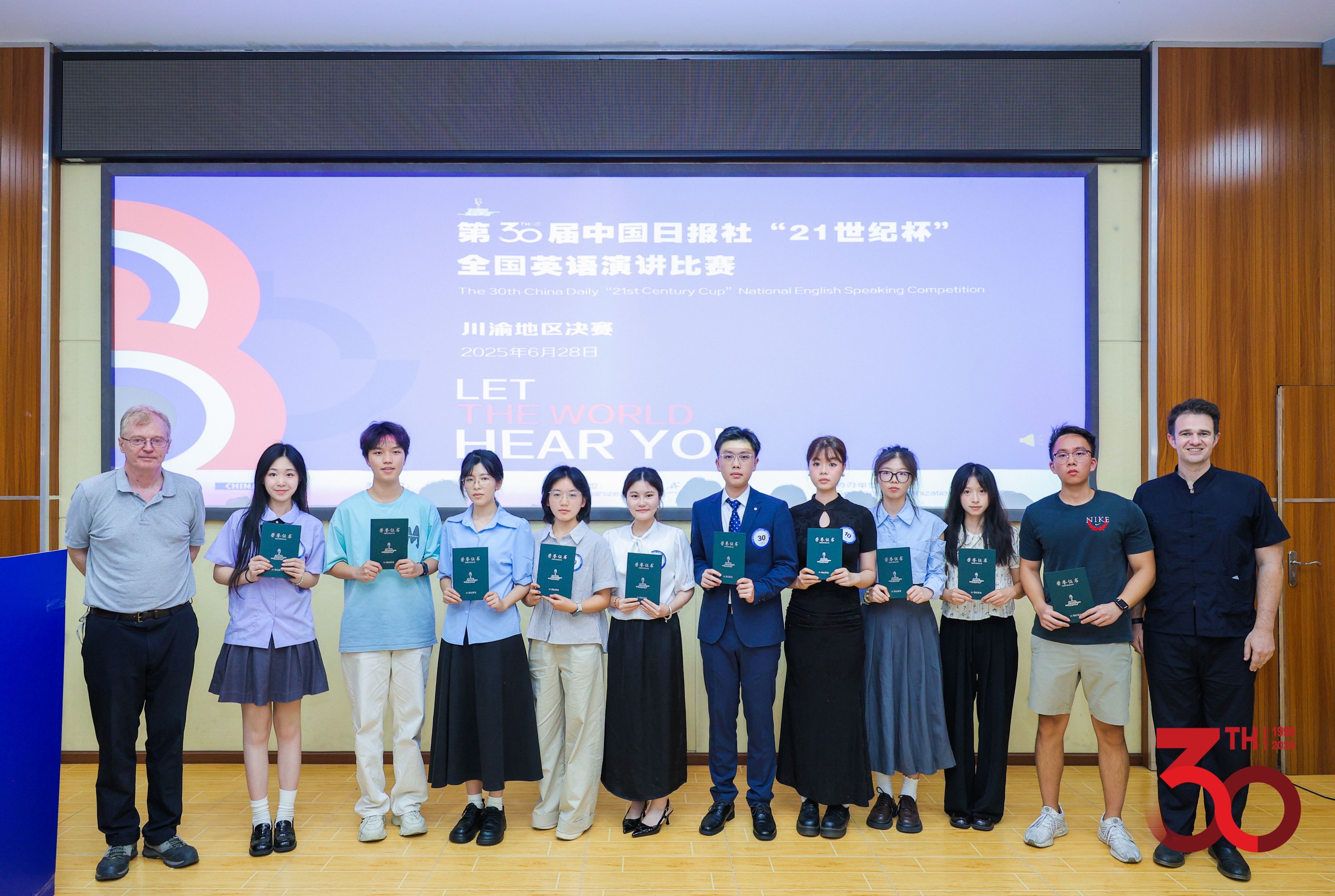 6月28日,第30届中国日报社“21世纪杯”全国英语演讲比赛“川渝”地区决赛在成都理工大学圆满落幕。本次地区赛吸引了来自重庆大学、四川大学、电子科技大学等20余所高校的41名优秀学子同台竞技。经过激烈角逐,我校郑子熙(24级数据科学与大数据技术专业)和杨馥榕(24级网络与新媒体专业)同学在基础学院蹇佳、谭涛指导下,脱颖而出,双双荣获三等奖。