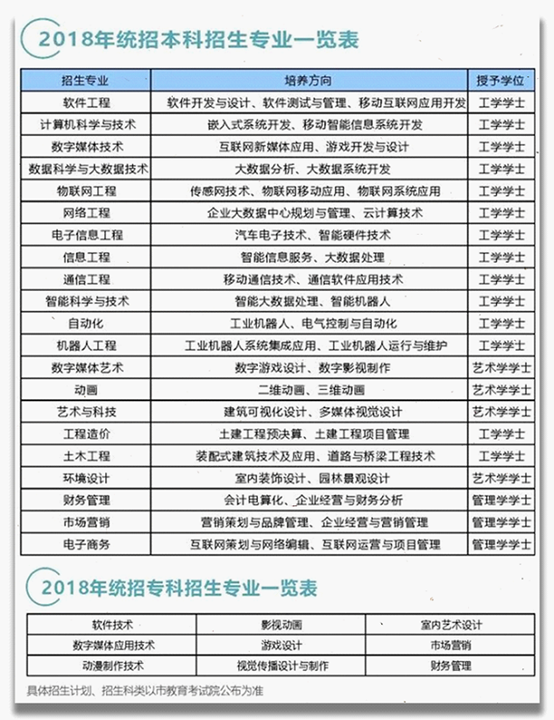 学校2018年招收全国统招本科及专科新生,其中统招本科专业21个,统招专科专业9个。招收科类分别为普通文理类及艺术类考生。