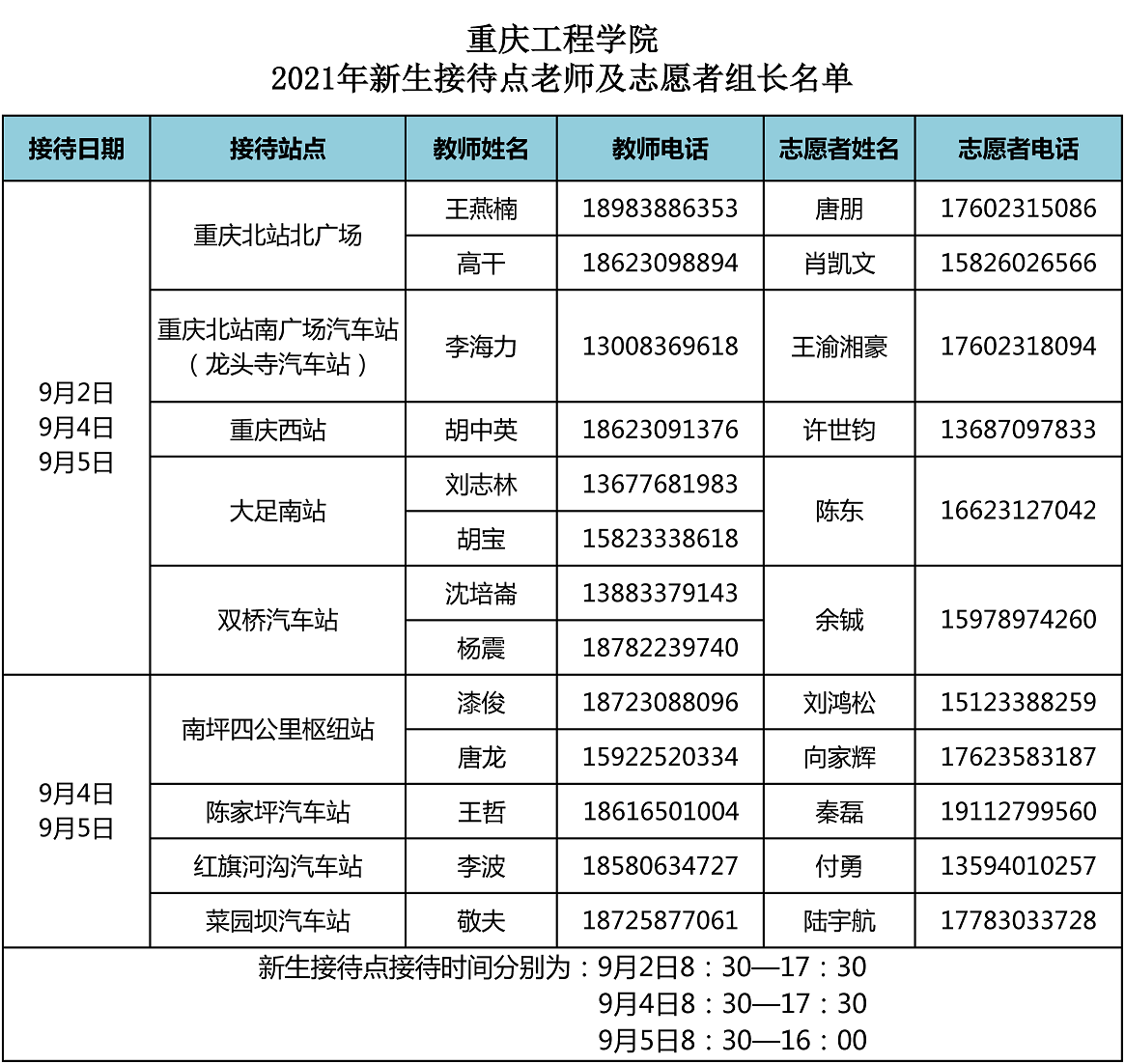 你们好!欢迎就读重庆工程学院!根据重庆市教育委员会和重庆市卫健委关于2021年秋季错时错峰开学的工作要求,我校对新生实行不同区域分批到校报到,其中市外低风险地区的非渝籍新生和滞留市外的渝籍新生于 2021 年 9 月 2 日到校报到;市内渝籍新生于2021 年 9 月 4 日~9 月5 日到校报到;重庆市外中高风险区的新生暂缓报到,请新生按规定时间来校报到注册。2021级新生报到地点为我校双桥校区,为方便新生到校报到,在新生报到期间,学校在大足南站、双桥汽车站、重庆火车北站、重庆北站南广场汽车站(龙头寺汽车站)、重庆西站、陈家坪汽车站、红旗河沟汽车站、南坪四公里枢纽站、菜园坝汽车站设有新生接待站点,并安排有专车(滚动发车)接送新生到校报到,各个接待点老师及志愿者(蓝色引路人)都身着有重庆工程学院标记的蓝色体恤和佩戴有重庆工程学院标记的工作牌。现将各接待点老师及志愿者组长名单及联系方式告知各位新生,若有需要咨询帮助的(因疫情防控,家长不能进入校园,请理解支持),请及时与各接待点老师联系,也可以和学校招生办公室联系,招生办联系电话:023-62846626、62846636。